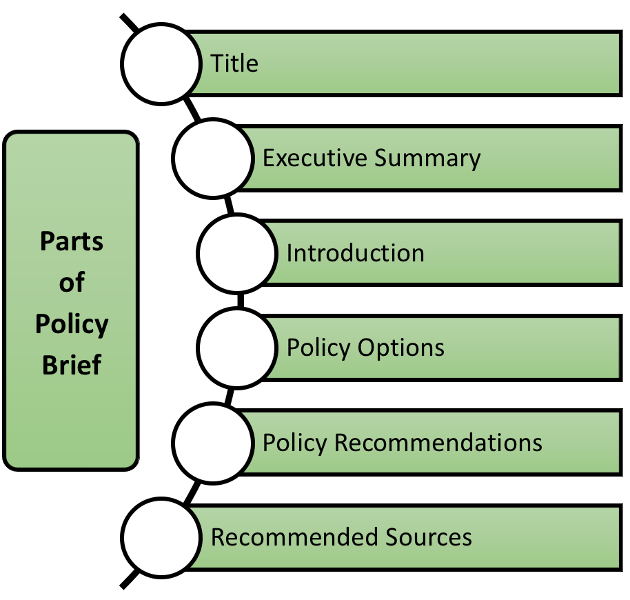 There are a number of formats for writing a policy brief. Irrespective of the format used, it should be logical and easy to follow. Most organizations or individuals develop a template for their briefs to ensure their message is consistent and clearly visible. Before submitting the brief, it must be proofread for any spelling or grammatical errors, unnecessary or missing information, etc. There are no hard and fast rules for how large a policy brief can be. We have seen policy briefs ranging from 2/3 pages to 8-10 pages. The decision is probably made based on the topic context and the target audience. Generally, policy briefs contain heading & subheadings and they are composed in short sections. Some important headings are shown in Figure 9.