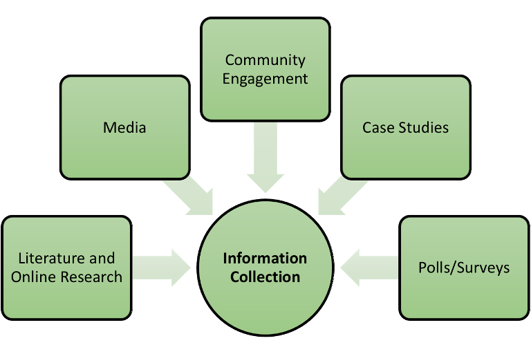 Step 4: Collect and Process InformationWe are living in an era where a vast amount of information is easily available and accessible. Extensive research needs to be conducted and information needs to be filtered so as to suggest the best course of action and prevent suboptimal decisions by policymakers. Step 4 involves extensive research using multiple sources: literature, online, media, conducting polls/surveys or using results of previous surveys, case studies and even active community engagement. Sources of evidence are summarized in Figure 7.