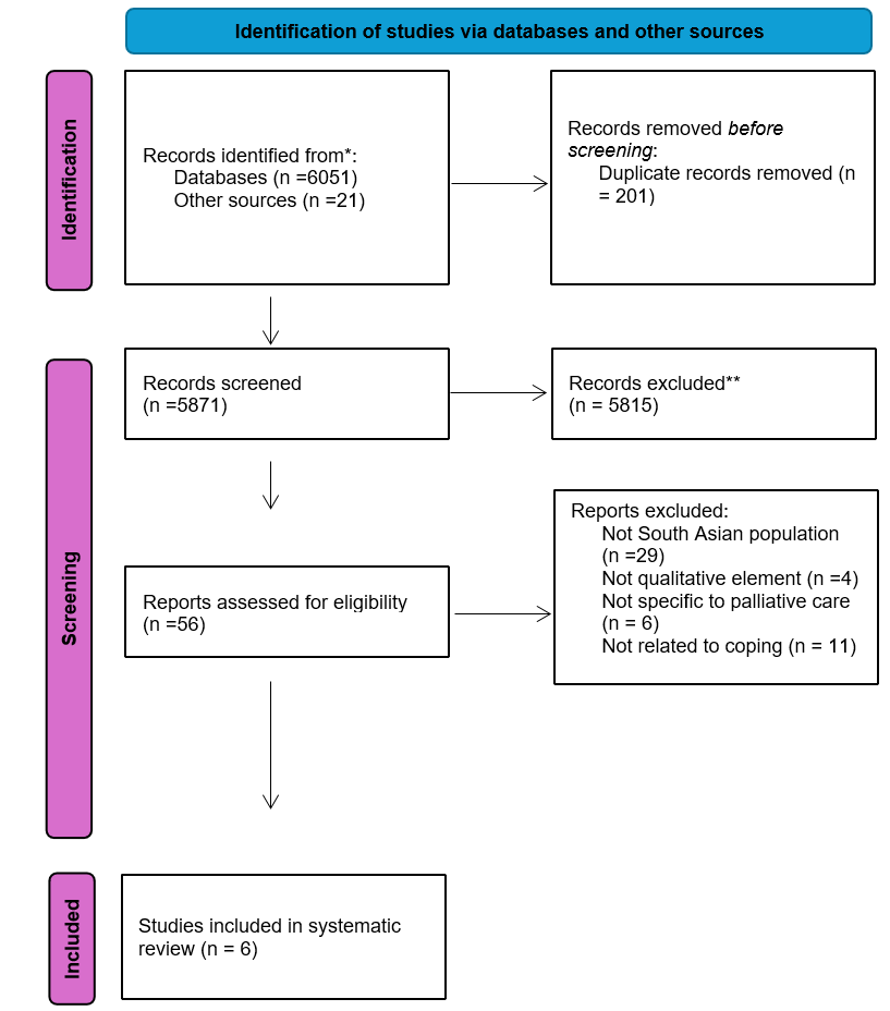 The following four databases were searched from inception to May 2024: Medline, Embase, PsycINFO, and PubMed. Searches comprised database subject headings and text words combining terms for ‘South Asian’ and ‘palliative care’ or ‘end of life care’ and ‘coping’ with the Boolean operators OR and AND (see Appendix 1 for the search strategy). Additionally, reference checking and citation tracking of the included studies were also performed.
