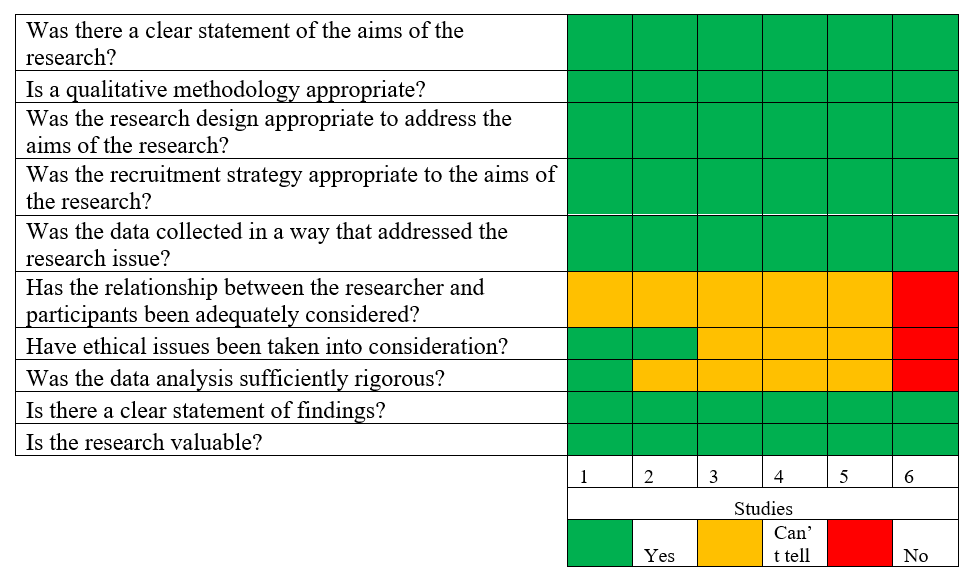 The quality appraisal of the studies according to the CASP criteria is outlined collectively below (Figure 2). This instrument incorporates 10 questions from the CASP checklist for qualitative data questions answered as yes (✓), no (×), or cannot tell (?).