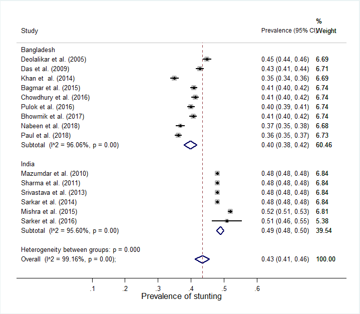 The inclusion criteria of a study to be reviewed were: i) study population must belong to Bangladesh or India, ii) studies must be either cohort, case-control, or cross-sectional, iii) studies must report information to compute effect sizes. On the contrary, the exclusion criteria were: i) lack of reference to the prevalence of malnutrition, ii) articles that do not follow our age criteria, iii) lack of access to the full text of articles, iv) non-relevance of subject matter and low quality of articles, v) lack of knowledge of sample size, and vi) written in another language than English. Articles that fulfill our criteria and do not have reason to be excluded were included in the meta-analysis.