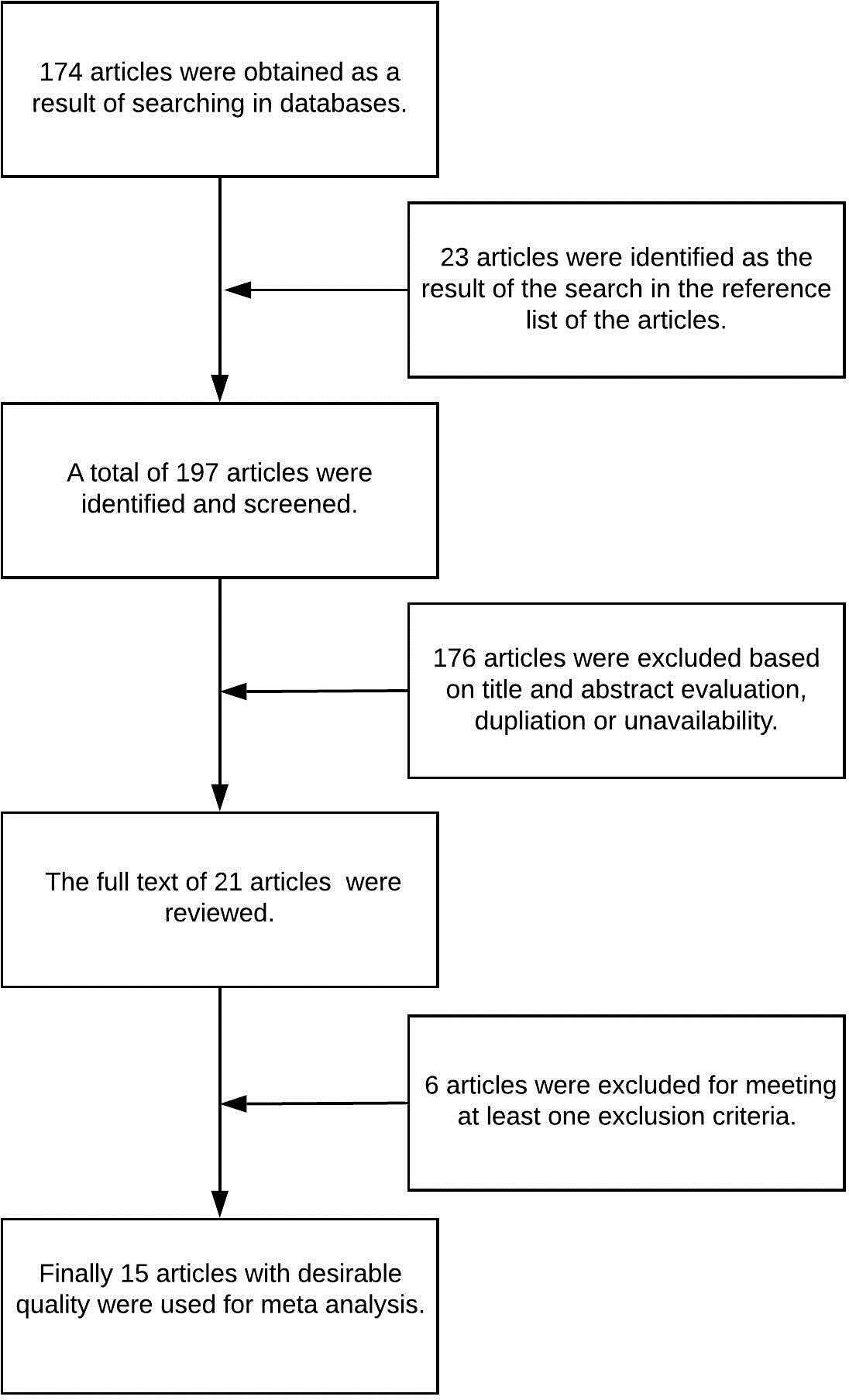 A total of 174 articles were found by searching keywords in databases (PubMed and Google Scholar). Additional 23 articles were included in reference list of the articles. After screening the title and abstract, and also duplication and unavailability of studies, 176 studies were excluded. Six more studies were excluded due to meeting one or more criteria of exclusion. Finally, Data were extracted from a total of 15 articles 4-6,8,9,13-22. Figure 1illustrates the inclusion and exclusion criteria for the available studies. Information from 15 articles was used for a pooled estimate of the prevalence of stunting, whereas for pooled estimates of the prevalence of wasting and underweight, extracted data from 13 articles were used.