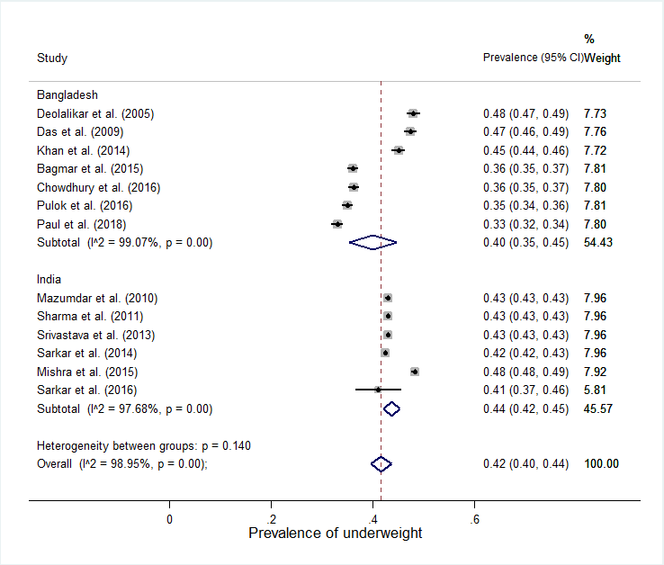 The forest plot for the overall prevalence of wasting is shown in Figure 3. For wasting, the pooled estimate of prevalence for Bangladesh is found to be 0.14[0.13,0.16], while it is 0.21[0.20,0.22] for India. Hence, about 14% and 21% of children under five years old are suffering from wasting in Bangladesh and India, respectively. The overall estimate of the prevalence of underweight for children under 5 years is 0.40[0.35,0.45] for Bangladesh and 0.44[0.42,0.45] for India (see Figure 4). The test of heterogeneity between the two subgroups Bangladesh and India reveals that the subgroups are significantly different (test statistic=47.96, df=1 and p-value < 0.05) for the response variable wasting while it is not significant for the response variable underweight (test statistic=2.17, df=1 and p-value-0.14).